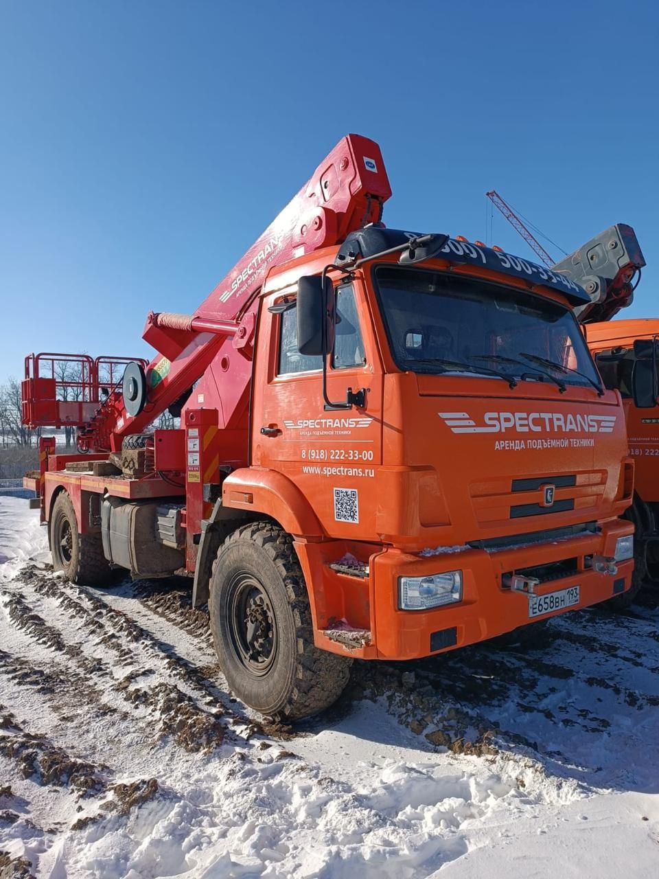 Автогидроподъемник на полноприводном шасси повышенной проходимости на базе КАМАЗ 4х4. Предназначена для работ на высоте в труднодоступных и труднопроходимых местах, таких как лесополосы, заболоченная местность и строительные объекты.